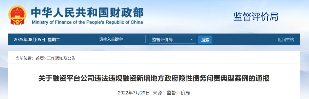 2022年7月:通報(bào)8起融資平臺(tái)公司違法違規(guī)融資新增地方政府隱性債務(wù)問責(zé)案例