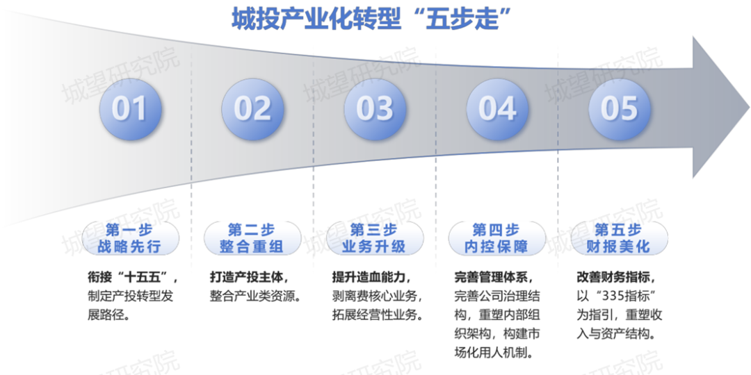 面向“十五五”,城望結(jié)合新時期城投發(fā)展實(shí)際,量身打造城投產(chǎn)業(yè)化轉(zhuǎn)型“五步走”策略——以戰(zhàn)略為引領(lǐng)、以整合為抓手、以業(yè)務(wù)為核心、以內(nèi)控為基石、以財務(wù)指標(biāo)為落腳點(diǎn)的轉(zhuǎn)型策略,為城投公司提供從戰(zhàn)略目標(biāo)制定到落地執(zhí)行的清晰藍(lán)圖。