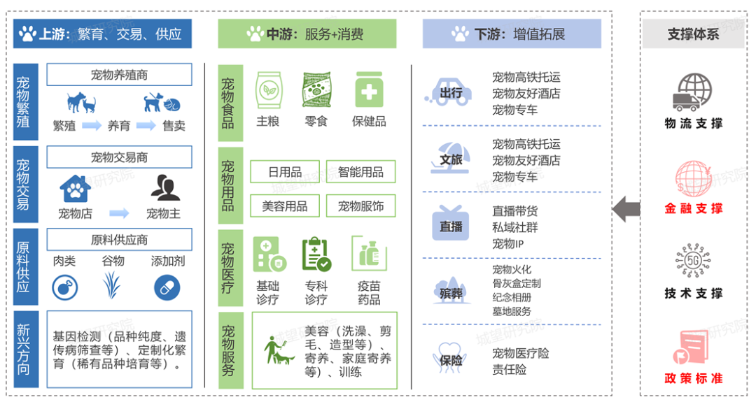 寵物經(jīng)濟(jì)產(chǎn)業(yè)鏈支撐體系有效支撐全產(chǎn)業(yè)鏈高效協(xié)同,主要包括: