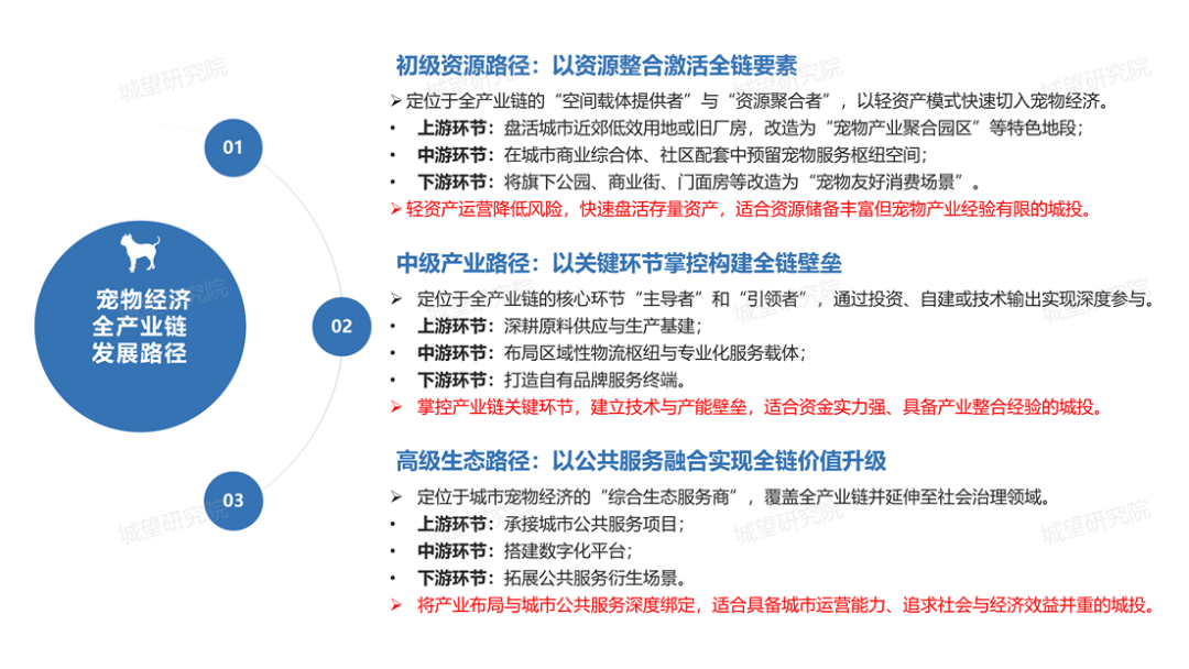 城投布局寵物經(jīng)濟(jì)全產(chǎn)業(yè)鏈,需根據(jù)自身資源稟賦與發(fā)展目標(biāo)選擇路徑:資源賦能型適合以存量資產(chǎn)激活產(chǎn)業(yè)初期生態(tài),產(chǎn)業(yè)鏈嵌入型適合以關(guān)鍵環(huán)節(jié)掌控建立競(jìng)爭(zhēng)壁壘,城市生態(tài)構(gòu)建型適合以公共服務(wù)融合實(shí)現(xiàn)價(jià)值升級(jí)。三者并非遞進(jìn)替代關(guān)系,可根據(jù)區(qū)域產(chǎn)業(yè)基礎(chǔ)與企業(yè)定位靈活組合,最終通過全產(chǎn)業(yè)鏈布局推動(dòng)寵物經(jīng)濟(jì)從“規(guī)模擴(kuò)張”向“高質(zhì)量發(fā)展”轉(zhuǎn)型,同時(shí)在“十五五”時(shí)期實(shí)現(xiàn)自身業(yè)務(wù)的戰(zhàn)略延伸。
