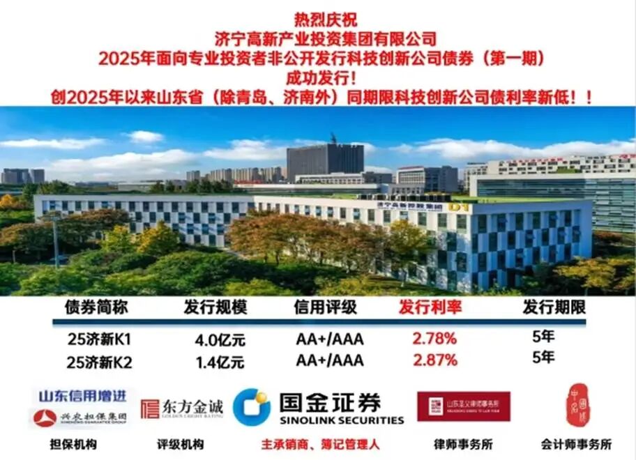 濟(jì)寧高新控股集團(tuán)旗下高新產(chǎn)投集團(tuán)成功發(fā)行第一期5.4億元5年期科技創(chuàng)新公司債券,創(chuàng)2025年以來山東省(除濟(jì)南、青島外)同期限科技創(chuàng)新公司債利率新低!