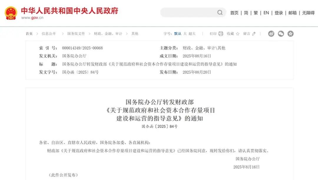 2025年8月20日,財(cái)政部發(fā)布《關(guān)于規(guī)范政府和社會(huì)資本合作存量項(xiàng)目建設(shè)和運(yùn)營(yíng)的指導(dǎo)意見》(國(guó)辦函〔2025〕84號(hào))。
