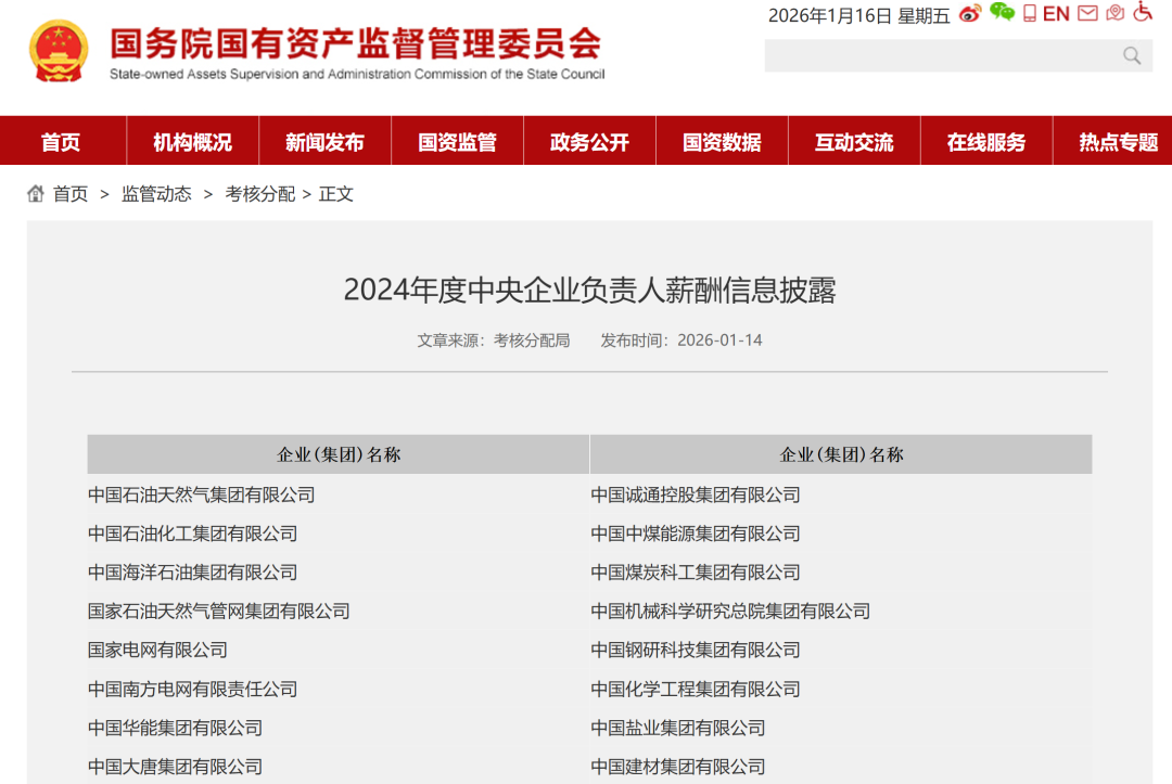 2026年1月14日,國務(wù)院國資委網(wǎng)站發(fā)布2024年度中央企業(yè)負(fù)責(zé)人薪酬披露。80余家央企分別在企業(yè)官網(wǎng)公布了負(fù)責(zé)人年薪收入情況。