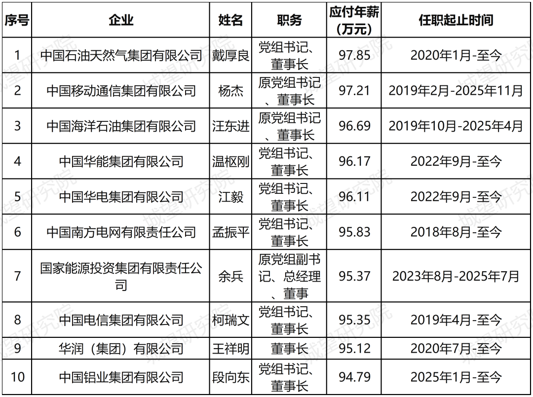 2024年度中央企業(yè)負(fù)責(zé)人應(yīng)付年薪中薪酬最高的是中國石油天然氣集團(tuán)有限公司黨組書記、董事長戴厚良,應(yīng)付年薪達(dá)到97.85萬元。